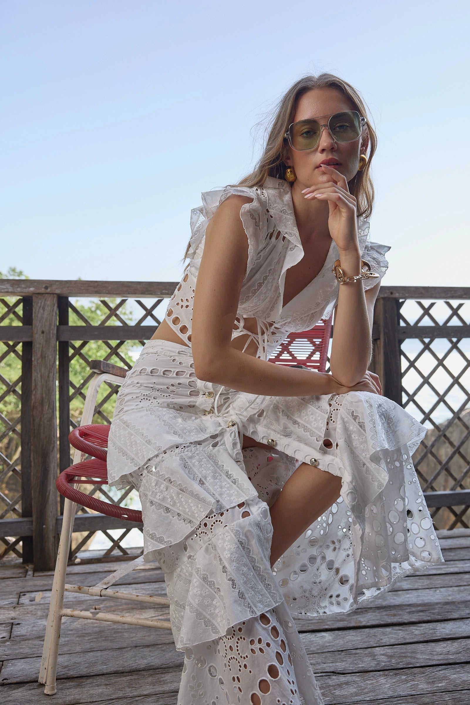 Our sought after Loulou ruffle blouse corset shape in a dress form, fitted pencil skirt falling mid calf, with a cheeky slit detail down the centre front of skirt, blouse has padded cup details, elasticated at the back to follow forms perfectly.